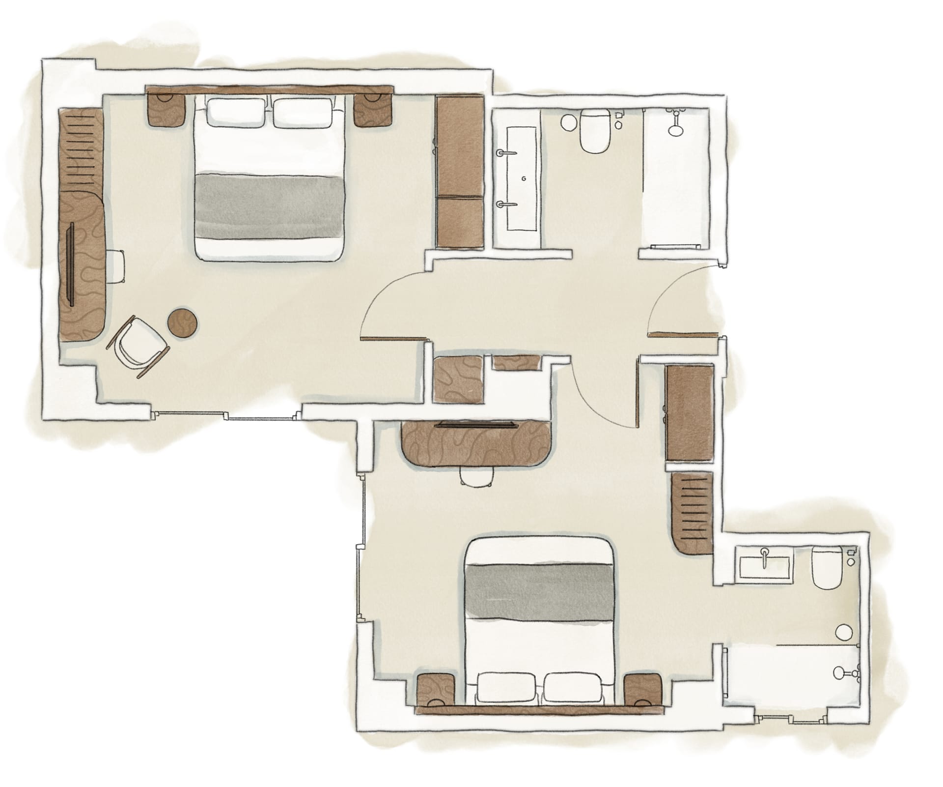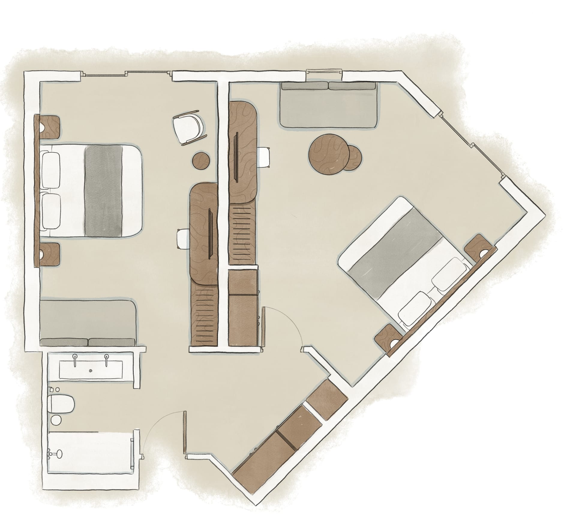 Family Suites stand out for their spaciousness, as they feature 2 separate bedrooms, one with double or twin bed and the other with two single beds that can accommodate the children or 2 adults;