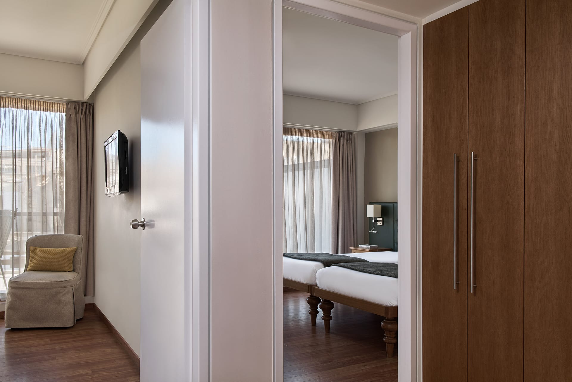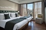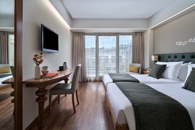 Our Deluxe Family room is the most ideal accommodation when travelling with your family or just a group of friends. The room features an inviting warm interior in earthly and olive green tones with city view and balcony.With two interconnecting rooms with an average total size of 35 square meters, up to 4 full sized beds, sharing a bathroom.They are equipped with sound-proof windows, air conditioning, flat-screen TV, mini-bar (that contains complimentary mineral water upon arrival), in-room safe, slippers, 24-hour room service, high-speed Internet access and complimentary Coffee & Tea facilities. The bathroom features local amenities, towels, W/C, shower, telephone and hairdryer.