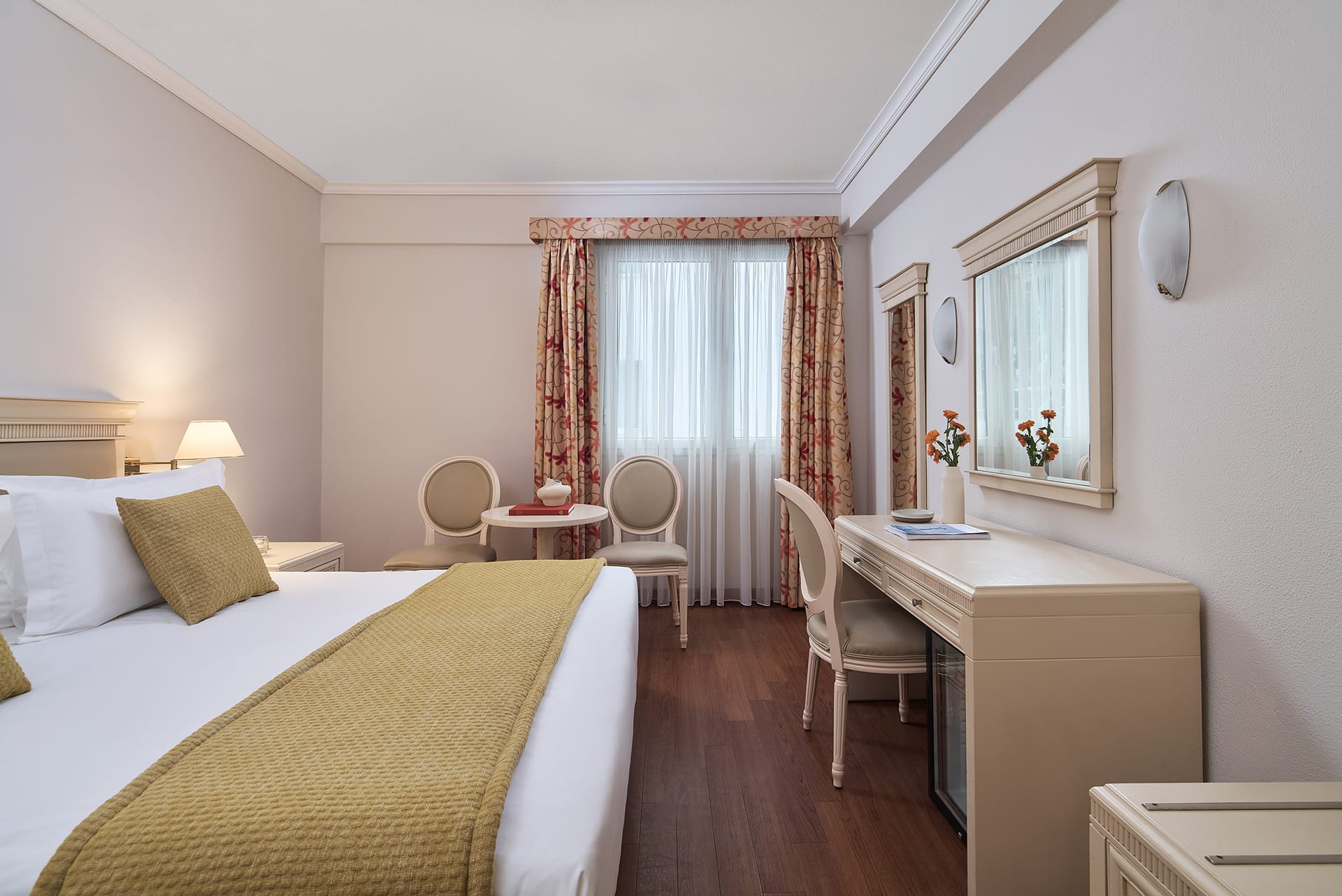 With an average size of 20 m2 for Standard Double, the standard rooms feature warm and welcoming décor with some (not all) offering view of the Panepistimiou avenue or Fidiou street,or in-House views They are equipped with sound-proof windows, air conditioning, flat-screen TV, mini-bar (that contains complimentary mineral water upon arrival), in-room safe, slippers, 24-hour room service, high-speed Internet access and complimentary Coffee & Tea facilities.The bathroom features local amenities, towels, W/C, bathtub, telephone and hairdryer. They are available with a double or twin beds upon request and upon availaibility.Maximum capacity is 3 persons. The third person can be accommodated either in a permanent single bed or in a rollaway portable bed.