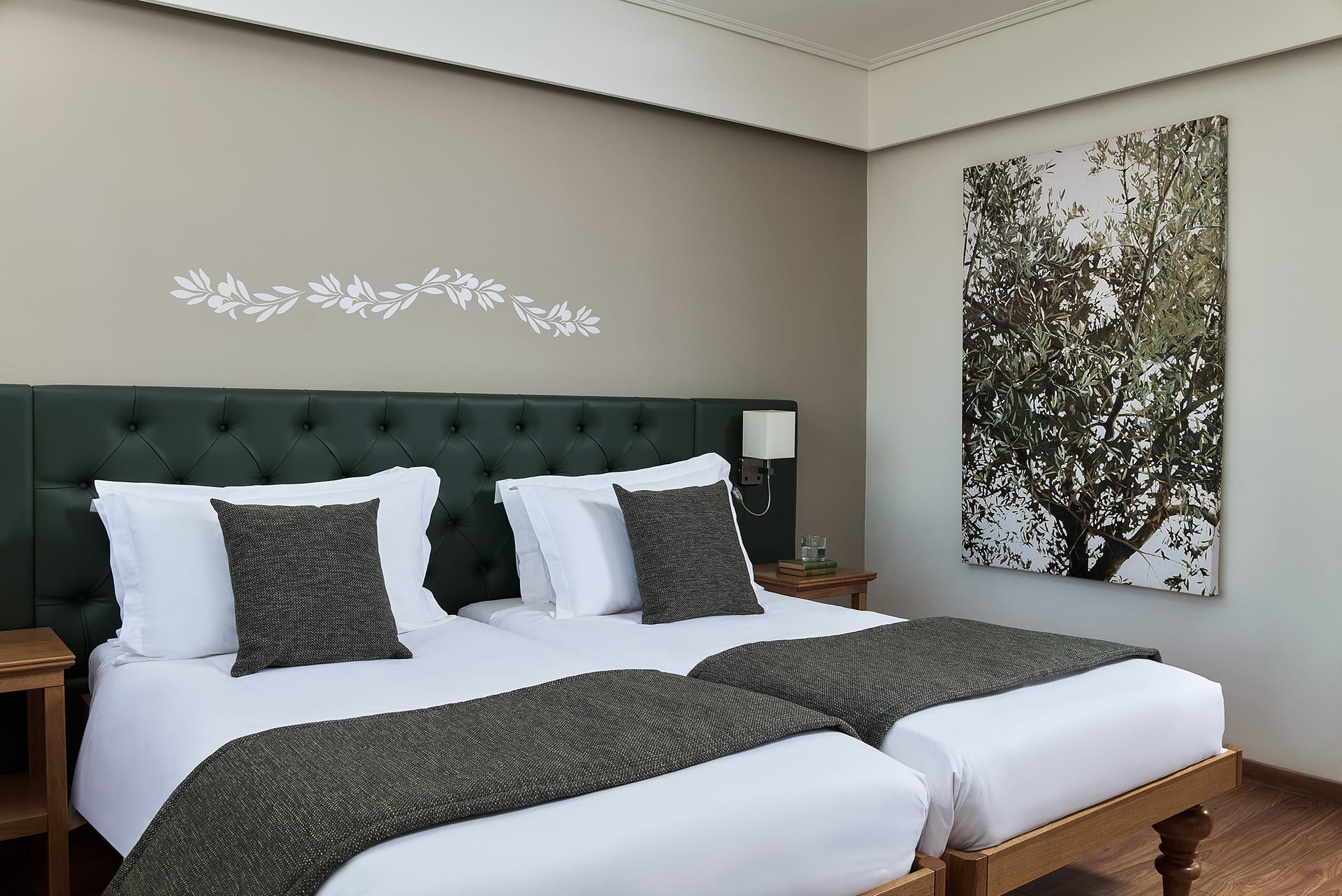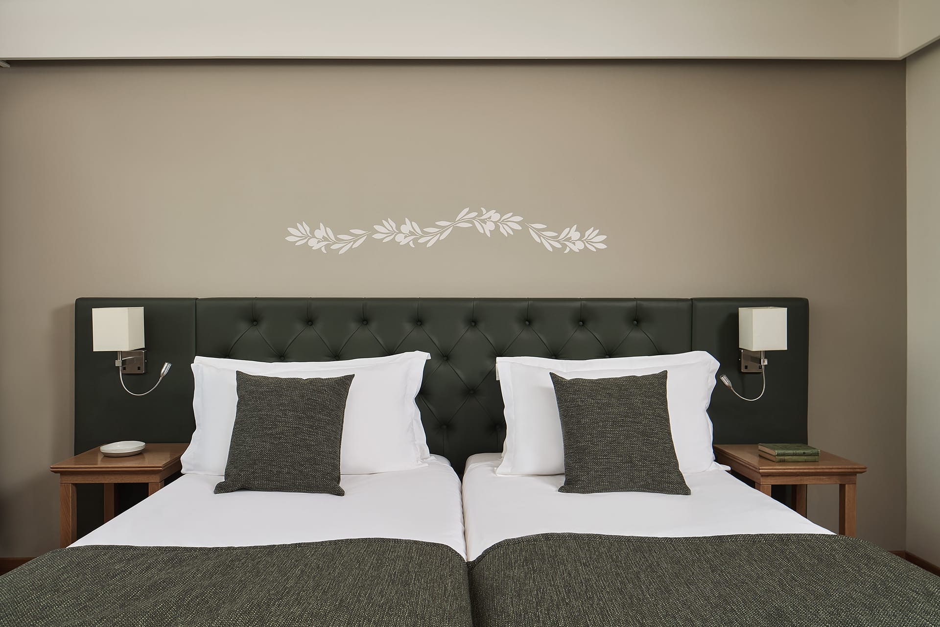 Superior City View Rooms. Fully refurbished featuring an inviting and warm interior in earthly and olive green tones with city views. Bright and comfort rooms with a size of 20 sqm can accommodate up to 3 guests.They are available with a double or twin beds upon request and upon availability. Maximum capacity is 3 persons. The third person can be accommodated either in a permanent single bed or in a rollaway portable bed.They are equipped with sound-proof windows, air conditioning, flat-screen TV, mini-bar (that contains complimentary mineral water upon arrival), in-room safe, slippers, 24-hour room service, high-speed Internet access and complimentary Coffee & Tea facilities. The bathroom features local amenities, towels, W/C, bathtub or shower, telephone and hairdryer.
